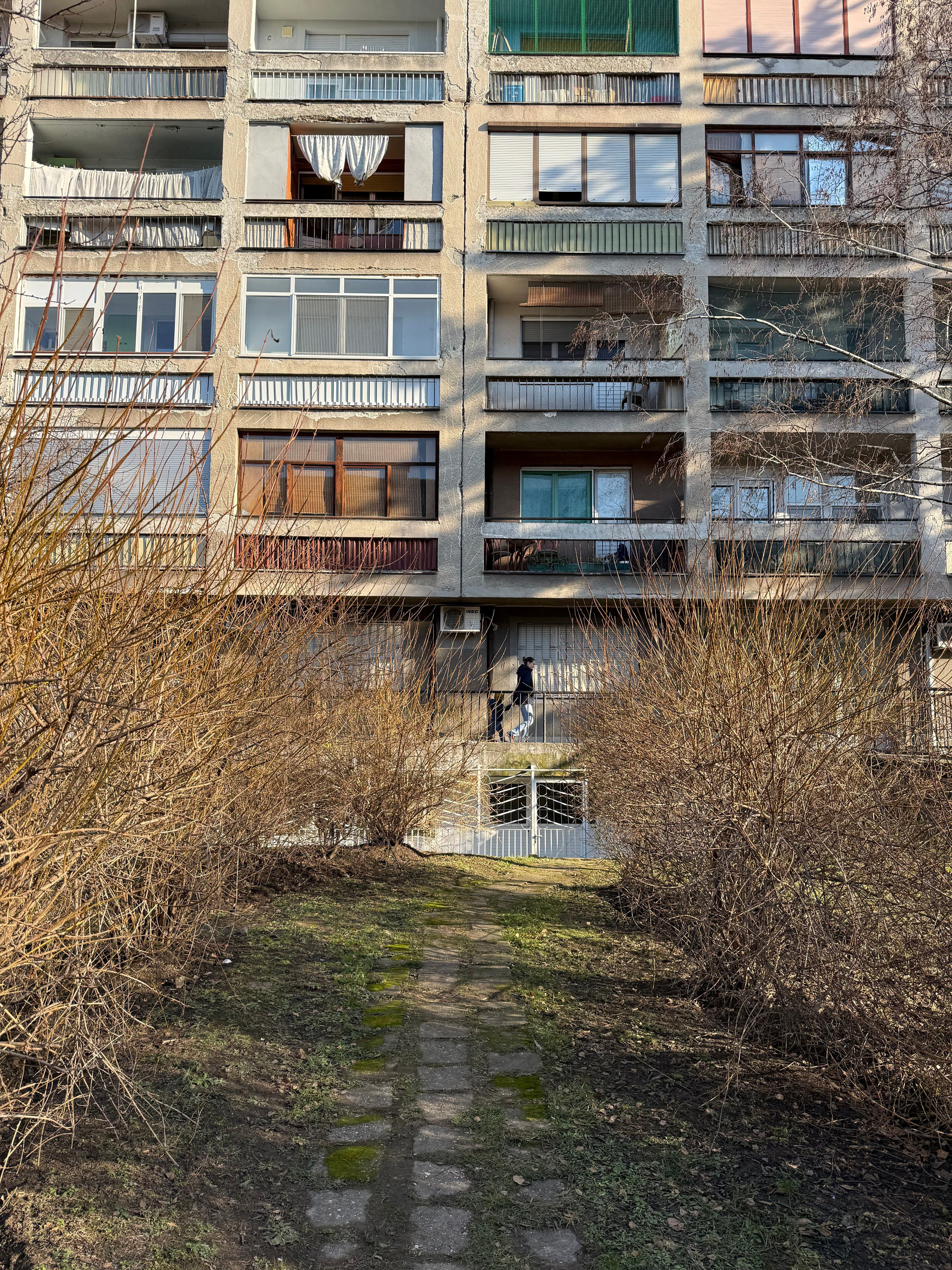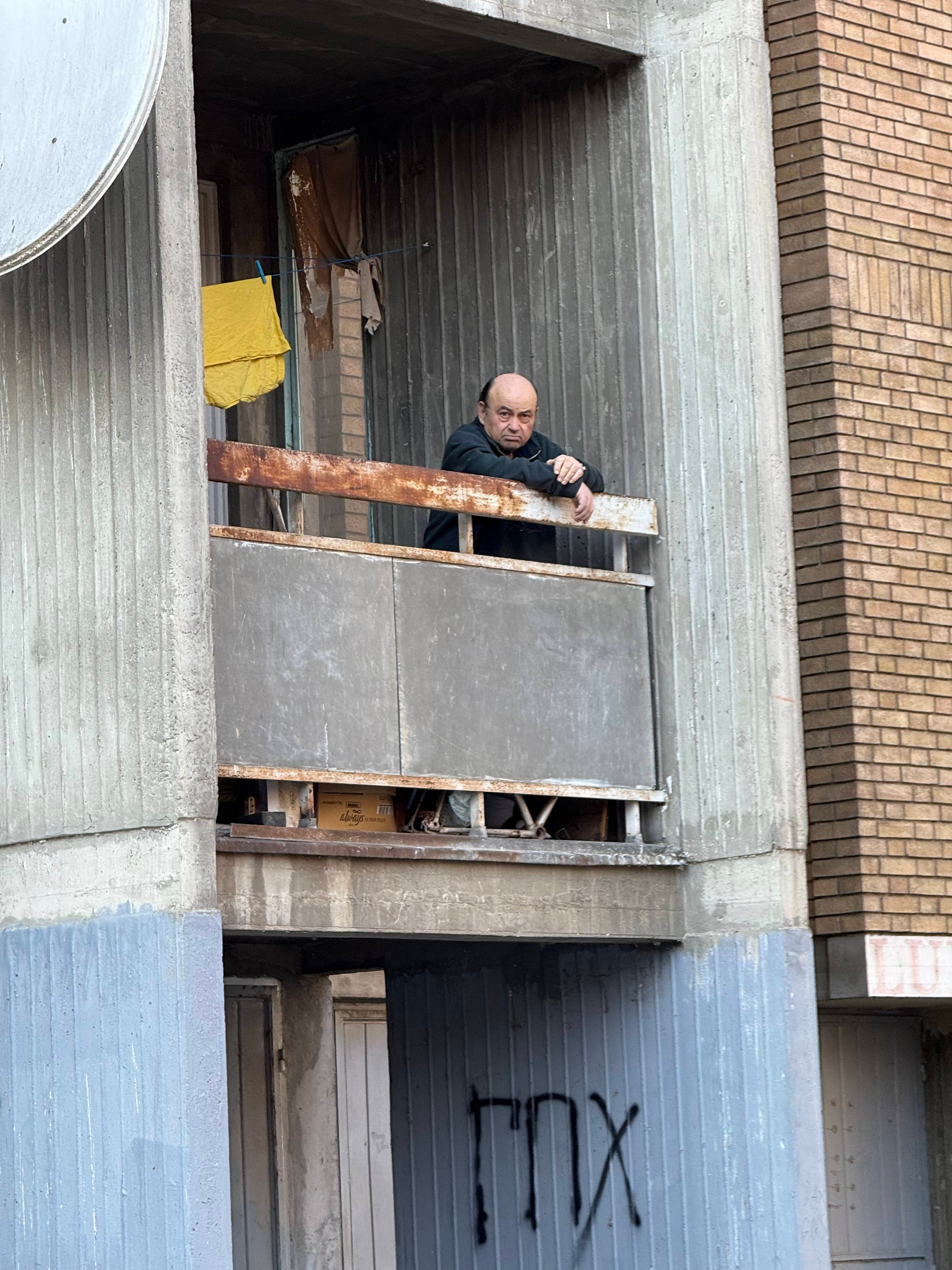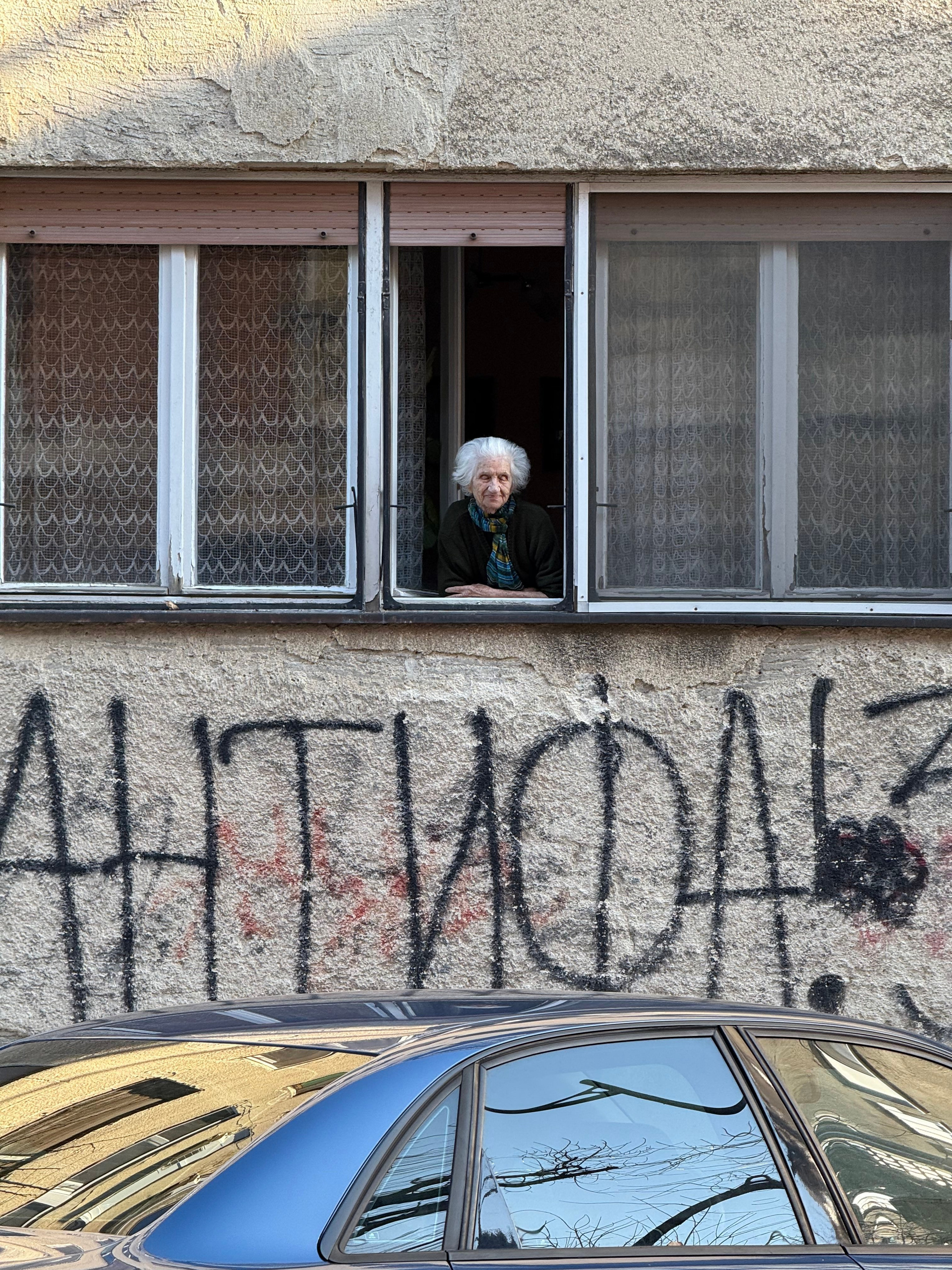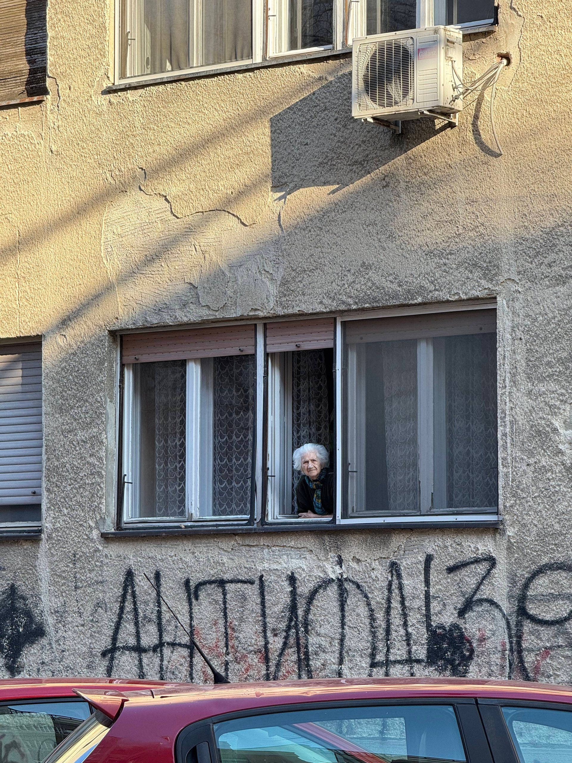 Идем в сторону Подбары. На улице из окна нулевого этажа выглядывает пожилая женщина. Я ее фотографирую из далека. Она на меня смотрит.