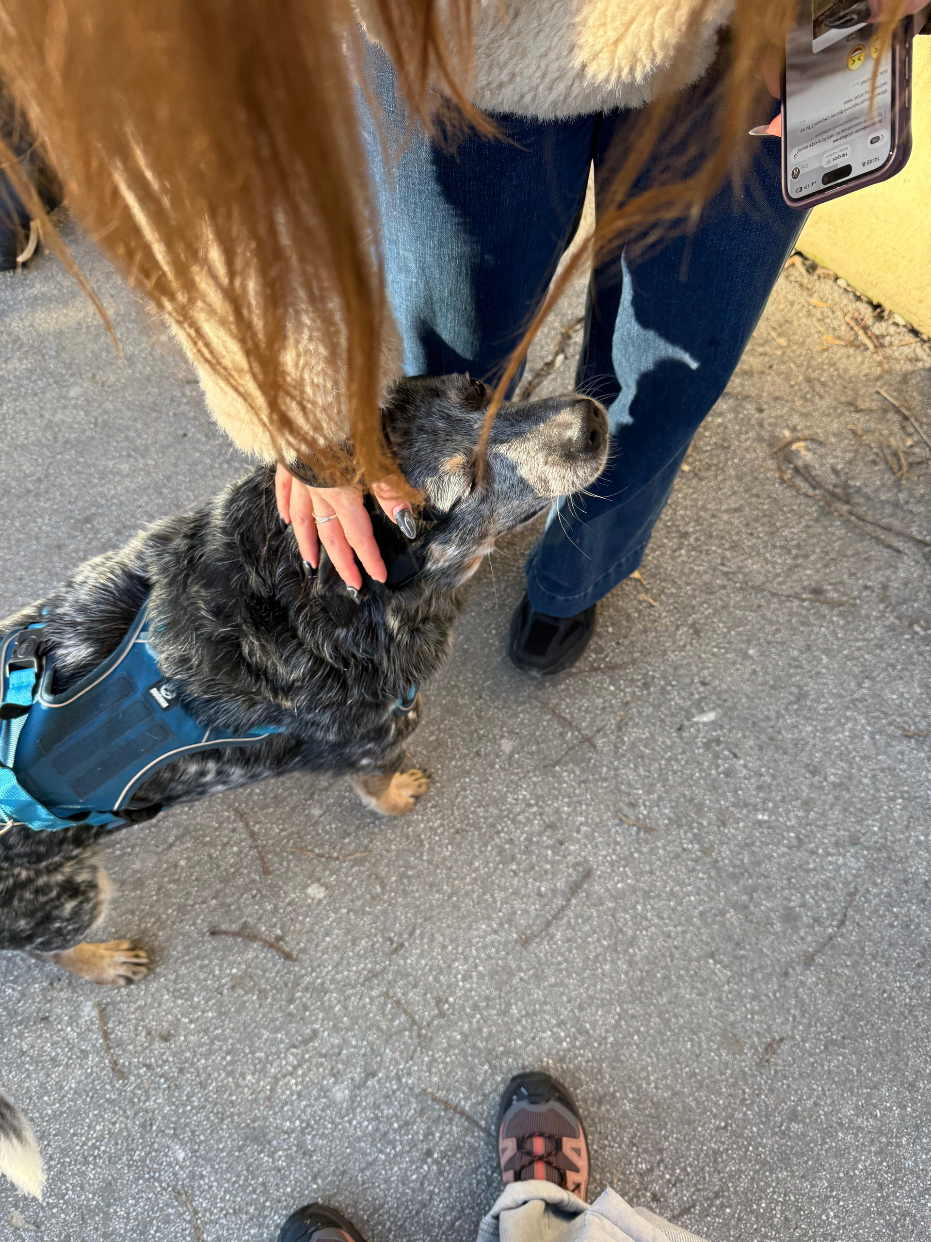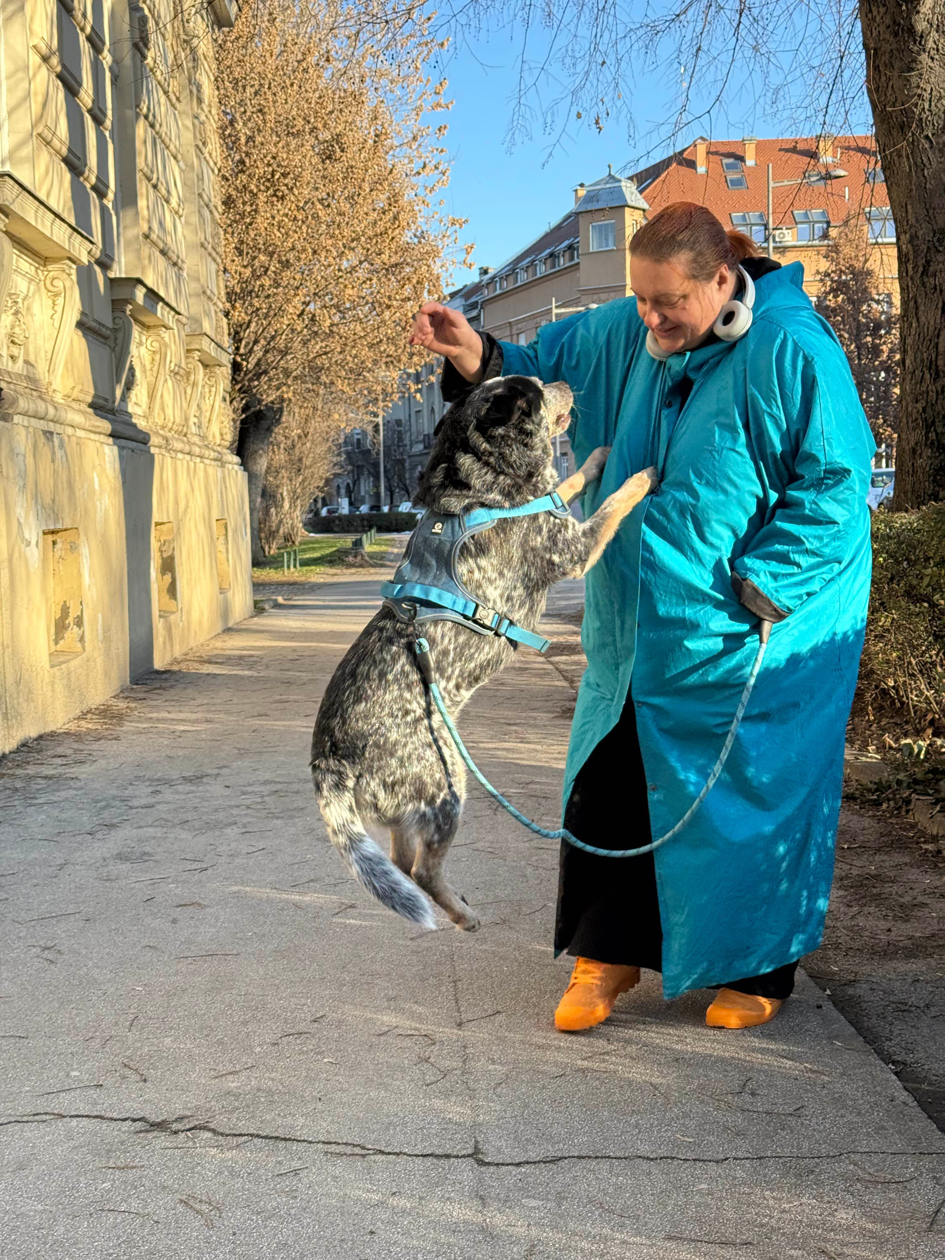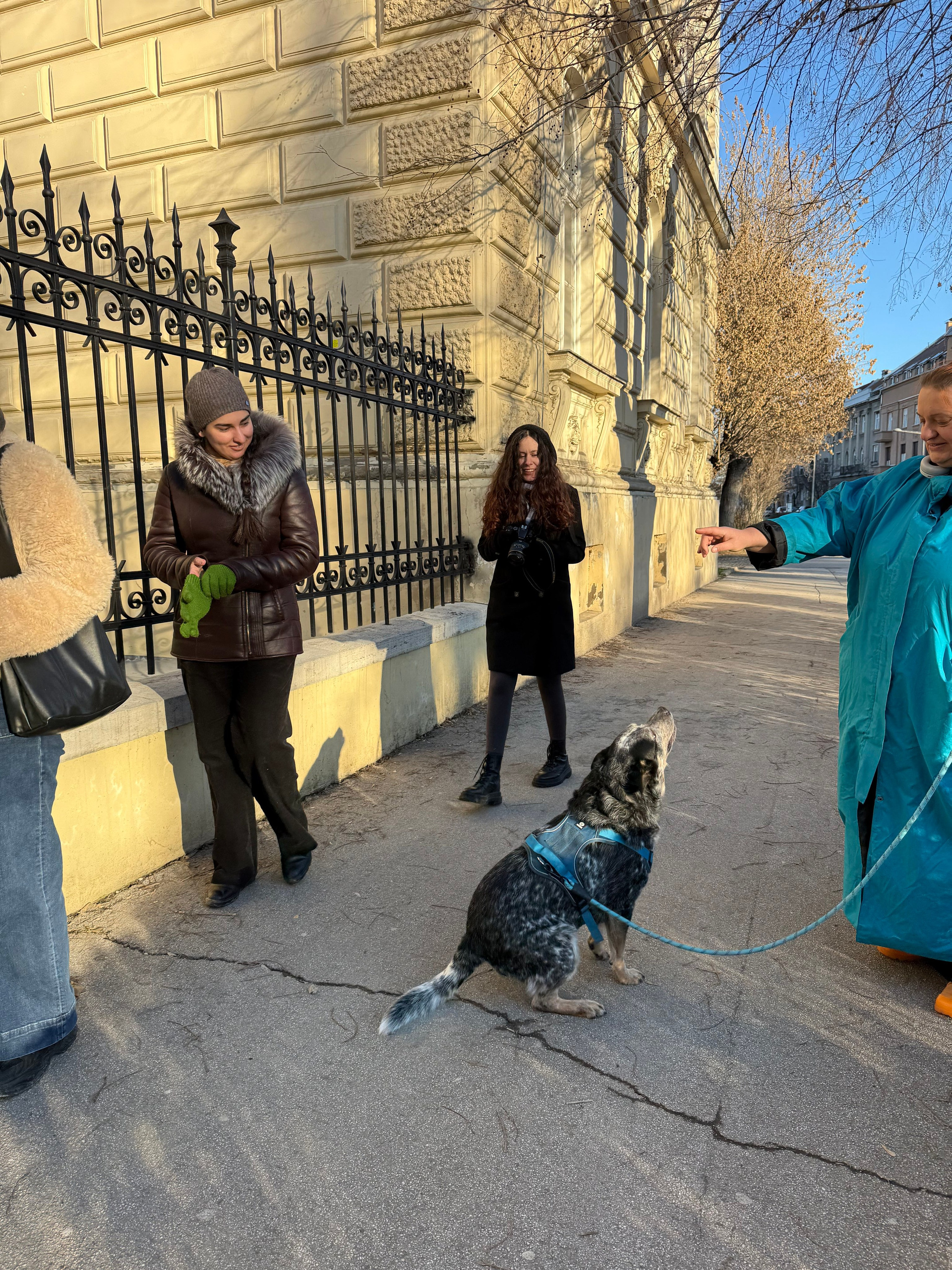 Женщина в голубом пальто гуляет с собакой. Собака ластится, мы ее гладим. Женщина говорит собаке показать енота. Все фоткают.