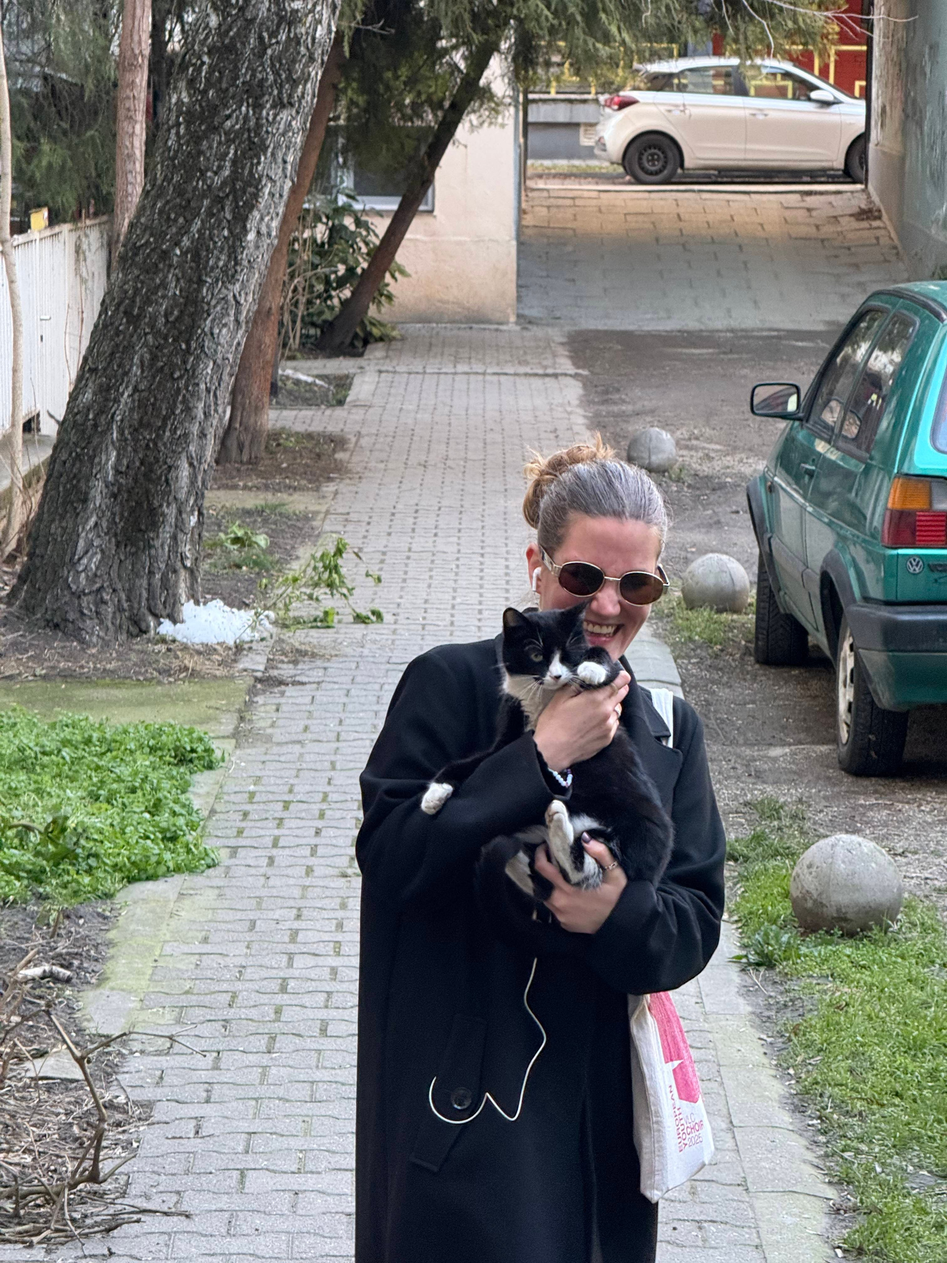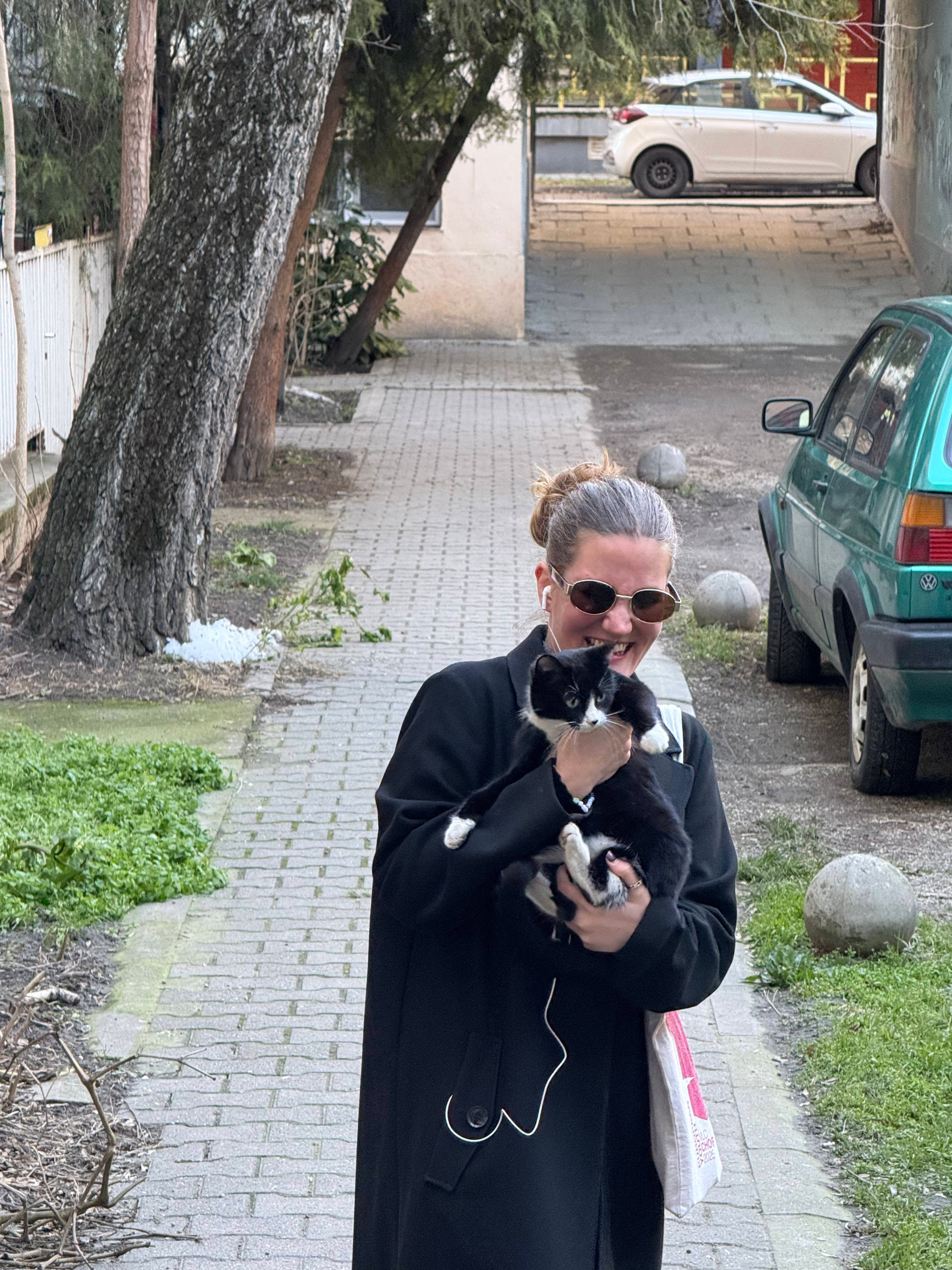 Заходим в какой-то двор. Навстречу нам бежит кот. Я пытаюсь его погладить, и он дается, но потом подходит к сербкине, которая берет его на руки.